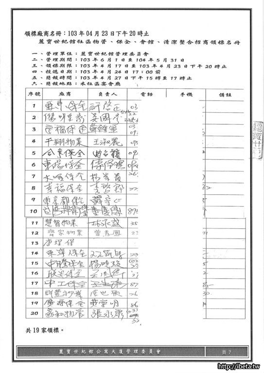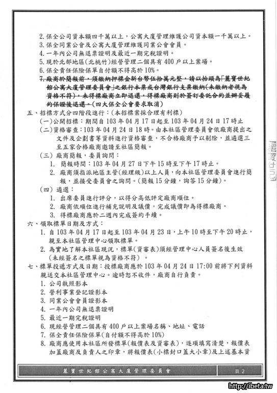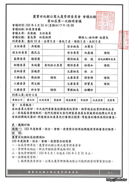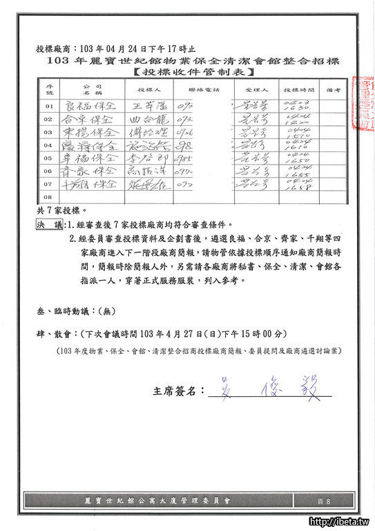 103年度物業、保全、會館、清潔整合招商投標廠商資格審查討論案