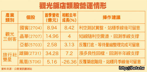 首季旅遊業的業者,因為春節假期較短,以致營收動能沒有明顯反映出來,按照過往經驗,首季的旅遊需求會往端午連假、暑假去遞延,使得旅行業者樂觀看待第二季,上半年有望提前慶豐收。