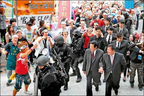 記者張菫宸/台北報導「雞排英雄」拍最後殺青戲,劇組大手筆在三峽封街,動員400多人演出由男主角藍正龍領軍抗議的大場面,女主角柯佳嬿更帶來電音三太子助陣,聲勢浩大。拍戲空檔,豬哥亮除了虧藍正龍的前女友大S跟別人閃婚,還幫藍正龍分析運勢說:「明年會很好!」藍正龍帶頭 綁布條抗議這場夜市攤販到議會抗議的橋段,由戲中飾演夜市自治會會長的藍正龍帶頭,包括趙正平、呂雪鳳、王彩樺和劉品言等人都綁上了「搶救八八八夜市」的白布條,藍正龍在鎮暴警察面前大喊「抗議!抗議!」頓時彌漫著緊張的氣氛。柯佳嬿所飾演的記者,這時帶了電音三太子和其他夜市攤販一起來助陣,讓抗議聲勢更為驚人,藍正龍笑說:「喊到燒聲」。