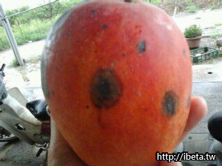 圖片中芒果所出現的黑斑是很成熟的表現, 也是告訴你要盡快食用完畢(也可以放置冰箱冷藏大約還可以放3~5天是沒有問題的)不是壞掉.這款情形在水果攤是很常見的,所以請有訂購的朋友諒解,你只要削掉皮即可,不用緊張