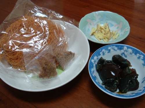 雞絲麵(含所附的調味包)、適量薑絲(約20g)、一顆皮蛋(需捏碎為數小塊)