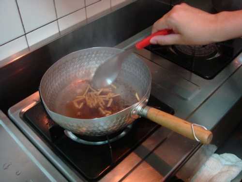 3. 倒入薑絲於鍋中,並以煎匙熱炒一番