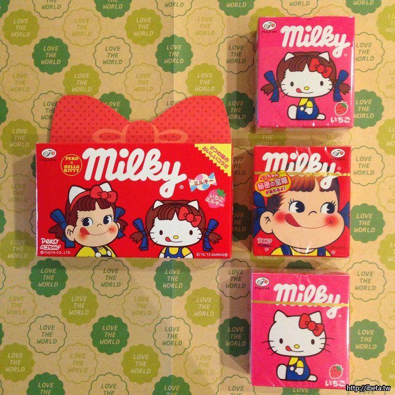 不二家從2013年起販售『牛奶妹x Hello Kitty Milky Gift』聯名系列,讓牛奶妹PEKO戴起貓耳髮箍,KITTY則是獻出第一次螢幕初嘴,模仿PEKO的招牌吐舌~紅色的蝴蝶結盒子包裝,內含兩小盒不二家牛奶糖,除經典的牛奶口味外,還有隨機變裝版的特殊口味(草莓.抹茶..)讓味覺視覺雙重滿足♡♡♡♡