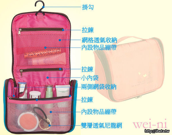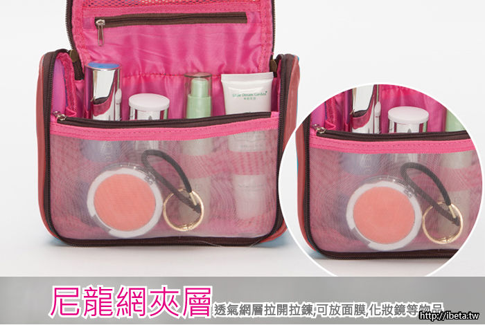 貼心掛鈎,可懸掛於浴室、房間等場所! 拉鍊網格袋設計,讓您可以看清楚放入的東西!