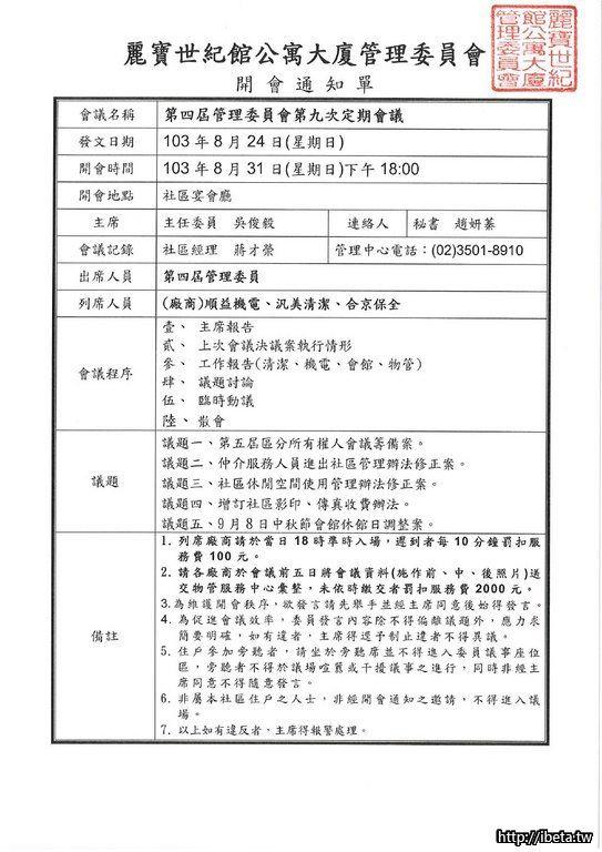 第四屆第9次定期會議通知單