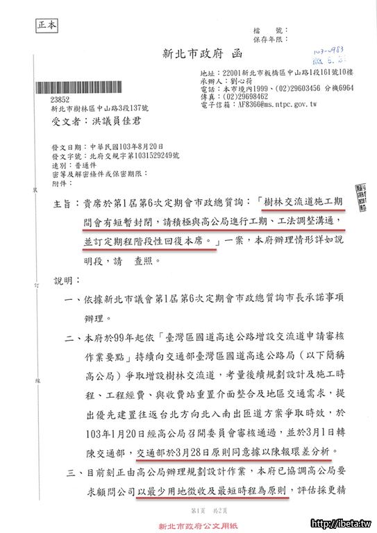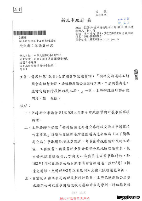 主旨:有關台端詢問「國道3號增設樹林交流道工程」進度1案,詳如說明,請查照。
