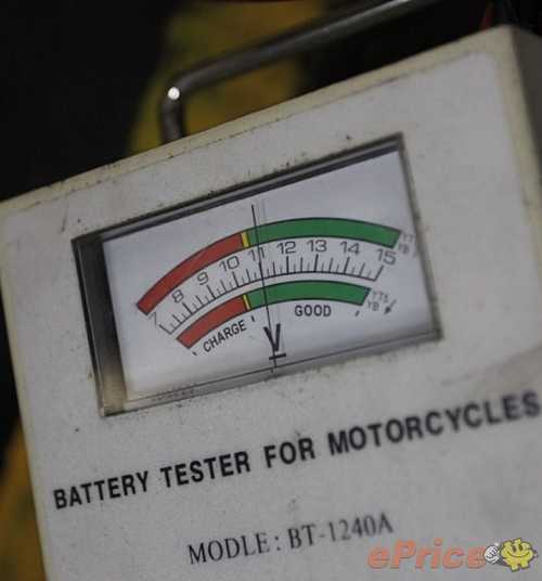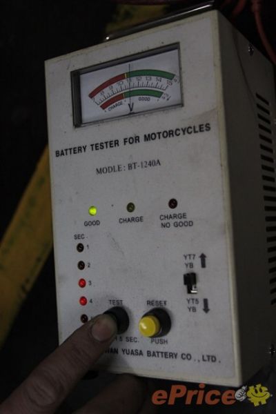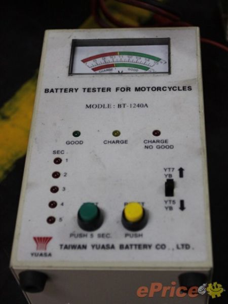▲由電池名牌 YUASA ( 湯淺 ) 出品的機車用電池測試器擔任這次測試新型環保電池狀態的重任。