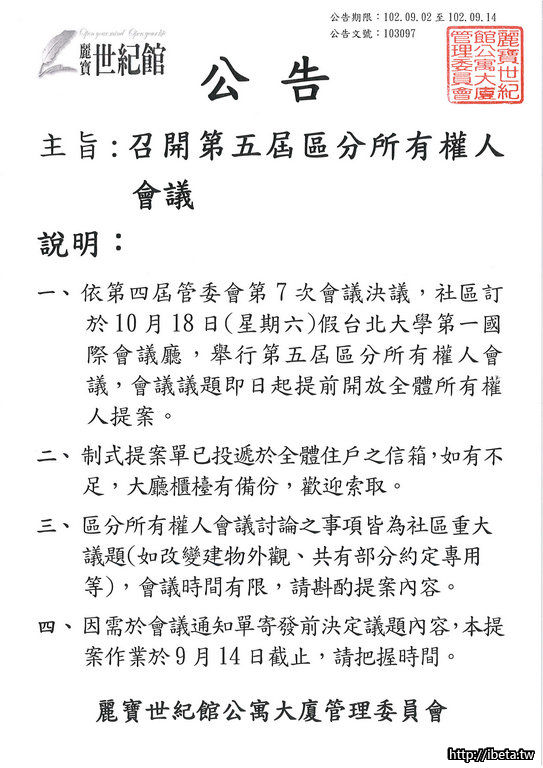 公告103097召開第五屆區權會
