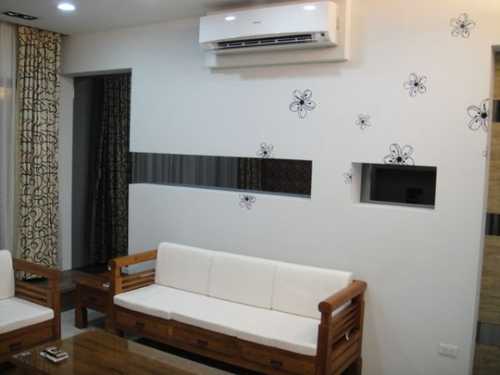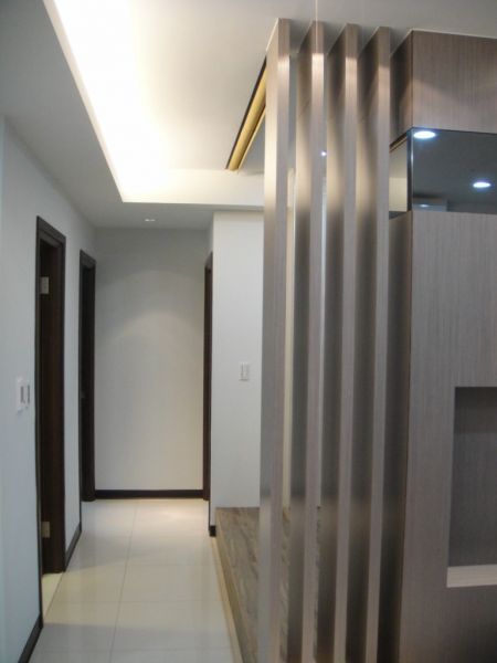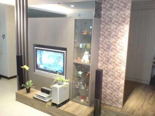 客廳複式牆,不僅解決壓樑問題,雪白的牆面,搭配內崁的灰鏡,再輔以櫻花壁貼,我覺得他有一種清爽不油膩的感覺,呵呵