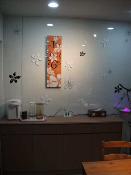 3.餐廳櫃上的油桐花牆:開啟大門,印入眼簾的是餐廳櫃上的油桐花玻璃牆,由油桐花造型時鐘引出整面的油桐花牆,在配合燈光,一整個很有fu的!