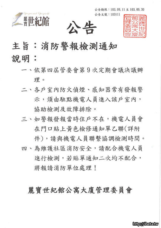 公告103111消防警報檢測通知