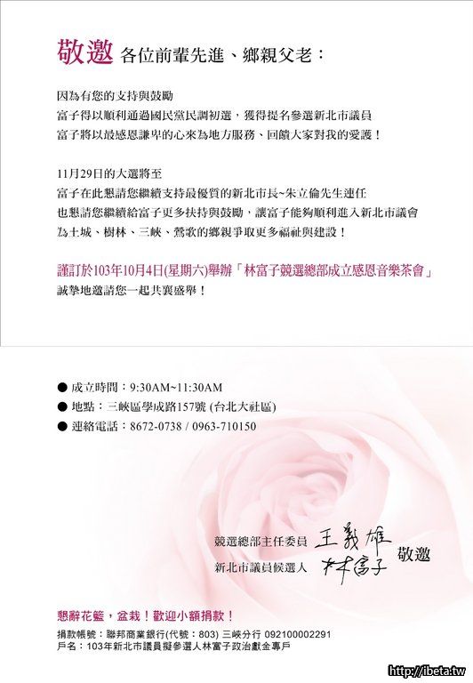 謹訂於103年10月4日(星期六)舉辦 『林富子競選總部成立感恩茶會』,誠摯地邀請您一起共襄盛舉。