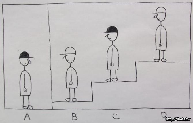 3. A與B、C、D之間有牆壁, 兩邊彼此看不見