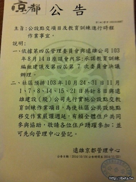 剛才(10/22)在電梯公告欄 閱讀到 以下公告 (上面日期是10/19(日)開始公告, 經詢問其他住戶, 是昨天(10/21)才張貼的, 且昨天忽然又撤掉, 有住戶去詢問, 結果又張貼上去), 請委員會 督導 物管PO此公告在 遠雄數位平台上 讓住戶們周知. 謝謝物管及委員會!