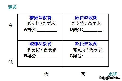 請爸比媽咪統計你的答案,A、B、C、D各有幾個,並填入以下表格。分數最高者,是你的主要教養風格,分數次高者,是你的次要教養風格。一般情況下,你會採取主要教養風格,行不通時,則會退而求其次,採取次要教養風格。[/backcolor][/p][p=20, null, left]
