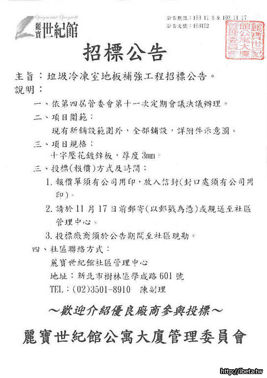 麗寶世紀館垃圾冷凍室地板補強工程招標公告