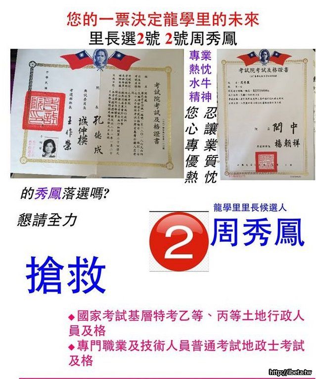 周詠青 發表於 2014-11-24 23:02 里內拜票:「里長選2號;2號周秀鳳」您的一票決定龍學里的未來。懇請支持!拜託!拜託! http://northrenti ...