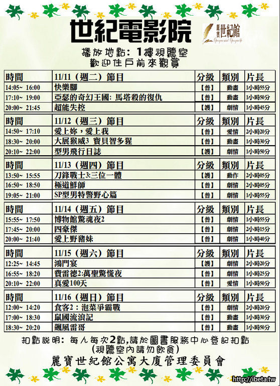 世紀電影院11/11~11/16節目表