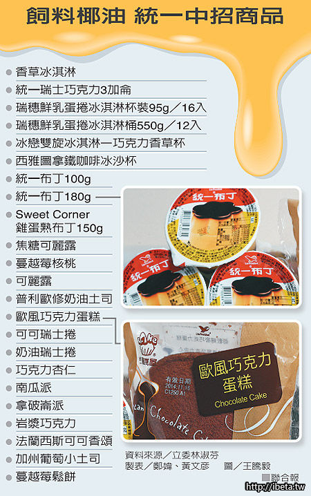 根據衛福部提供給林淑芬的問題椰子油產品清單,統一冰淇淋、統一布丁等受民眾歡迎的商品也難逃