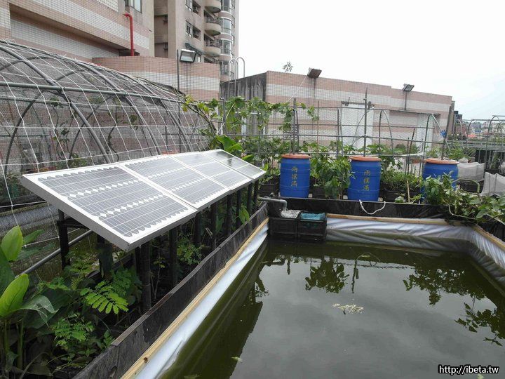 利用社區水池,回收雨水作為水池、澆灌、清洗之用,並進一步規劃魚菜共生系統,收益回饋於社區,利用太陽能板供應馬達電力
