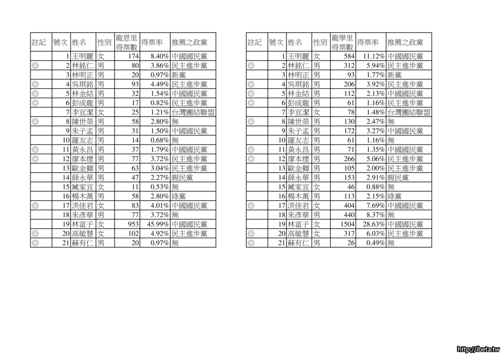 2.上屆王明麗+洪佳君囊括北大近6成選票在這屆分別轉移至林富子, 朱彥華及朱子孟身上, 造成選票分散以致僅有洪佳君順利當選, 王明麗則高票落選.