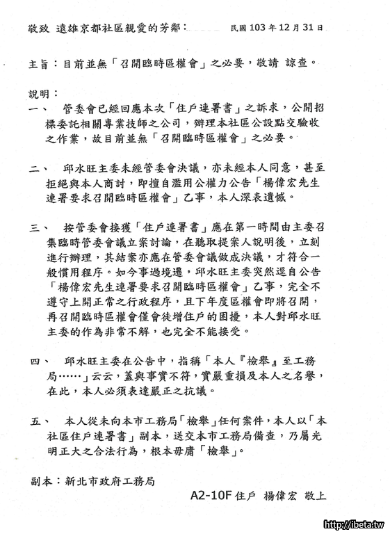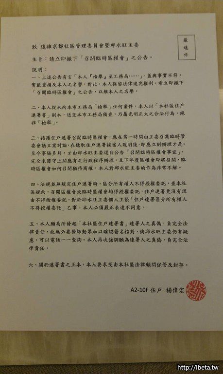 放個炮,搞個連署,還去檢舉,要讓社區被罰款, 把社區搞混亂,就不關已事?不辦就寄存證信函說要提告, 管委會要處理,就又說不需要,一切楊偉宏先生說了算嗎?? 大家閒閒沒事,專辦他的事務?? 請問京都社區或楊偉宏先生花多少錢聘請邱主委?? 楊偉宏先生是京都社區的老闆?? 大家要聽命他?