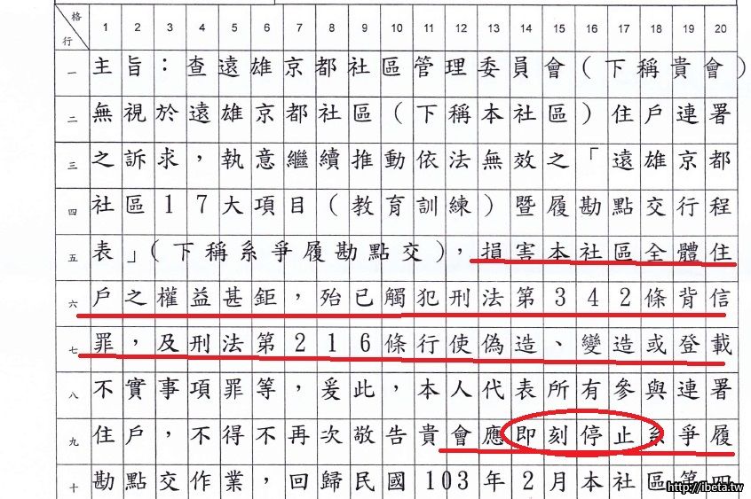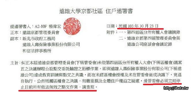 我在這再次提醒你們這些人,如果不記得,在京都社區三年來所有說過的話,寫過的EMAIL,開過的會,簽過的字,如何跟別人胡扯瞎掰, 真別在那裏一天到晚嗆聲別人違法,要提告之類的,我個人所有說的都絕對會有所本,且絕對查驗非常清楚, 所有資料記錄都已經匯整保存,將來都是證據, 要做甚麼事,說甚麼話之前最好自己好好想想 !