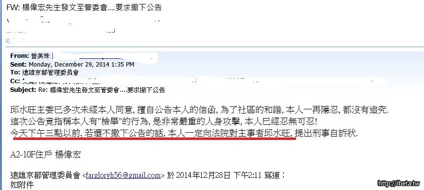 楊先生溝通的方式就是: 我命令你...或 XX點來,否則... ,這叫與人溝通?? 他是皇帝還是老闆?? 第一天馬上命令物管要下架公告,然後要物管打電話要求邱主委幾點前到物管,否則.....,眼見邱主委不理會他,就一直發email然後用這種方式?? 這個人的溝通是這種方式?? 還能說他隱忍很久?? 還說公告他私人信件?? 挖低咧! 甚麼叫多次? 楊偉宏先生你憑甚麼叫邱主委多次? 何時誰對他私人信件有興趣??以邱先生的水準和時間,絕對對他這個人完全沒興趣! 也不想浪費時間在這個人的身上! 連一個良好的態度及做人基本的禮貌都沒有,真是夠了! -------