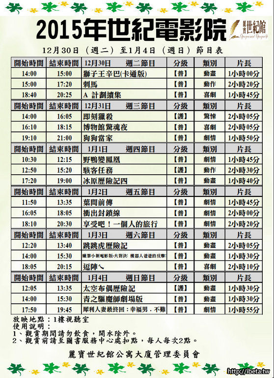 世紀電影院12/30-01/04節目表