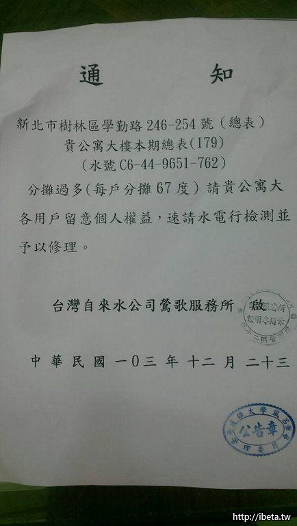 公告在D棟電梯裡, 請攜帶暴增的水費帳單去物管登記,