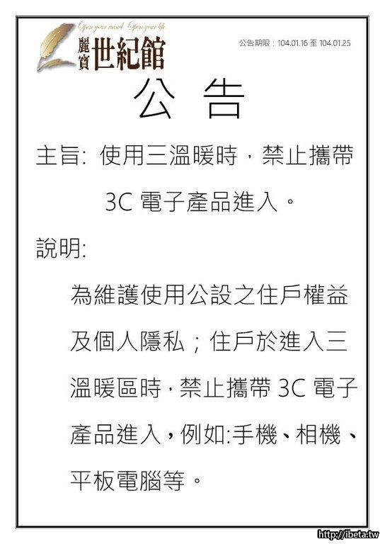 公告104007 使用三溫暖時,禁止攜帶3C電子產品進入
