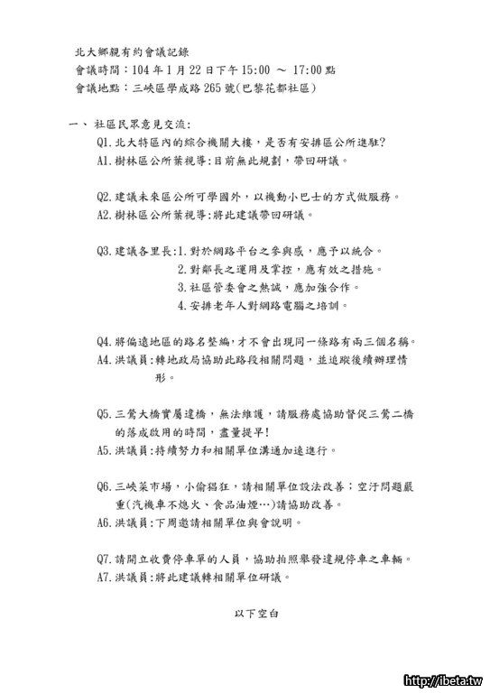 您好!北大鄉親有約即是平台,無論針對施政建議或陳情,讓政府了解問題,能否解決須各方努力。過去幾年,此平台具有實質成效,舉凡三鶯捷運、三鶯二橋、聯外道路、樹林交流道、學校興建等等重大建設,小至於公園設施增設、公車系統增加、交通號誌劃設,甚至於社區相關問題,大部份於此會議得到協助促成,但非每件成功,但讓政府官員多下鄉了解民意總是好,不是嗎?!