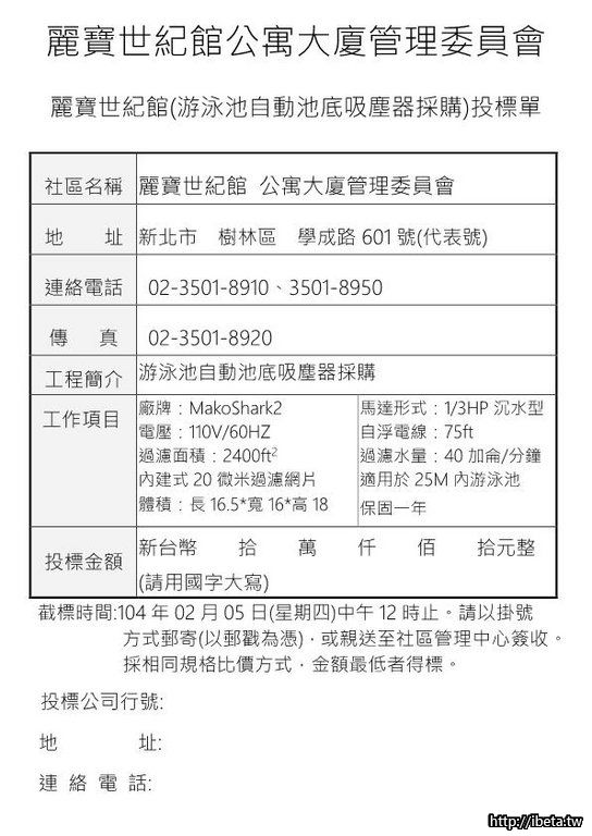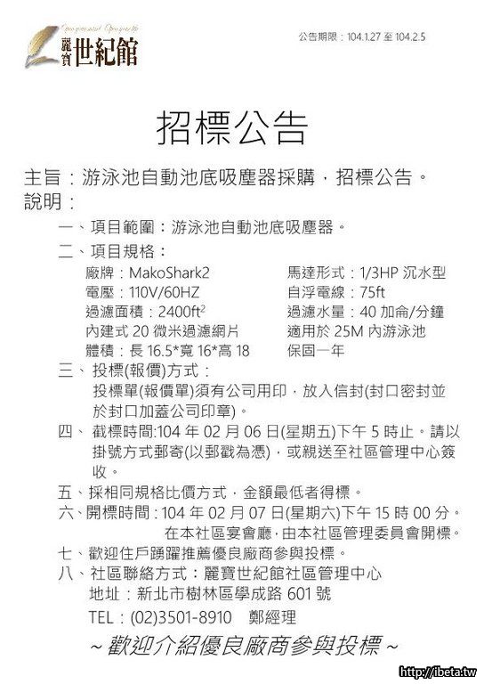公告104015 游泳池自動池底吸塵器採購,招標公告