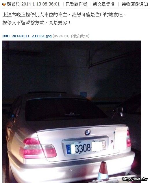 Beetle 發表於 2015-2-16 13:45 我也遇過一次,找了物管來也沒輒,只能在車後貼了張規勸單, 不過物管有另外安排個臨時停車位給我就是了! ...