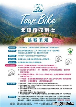 想為自己騎車賞櫻留下紀錄的人,可以順道參加「北橫櫻花勇士挑戰活動」,加入櫻花勇士的行列,騎乘路線:起點慈湖導覽服務站->三民->角板山行館->羅浮->巴陵大橋->終點拉拉山旅遊服務中心,距離42.9公里。