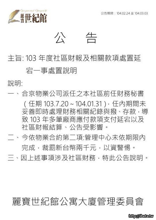 公告104022 103年度社區財報及相關款項處置延宕處至說明