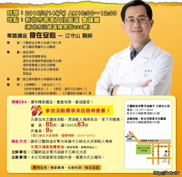 活動報名 : 請洽江醫師追求零污染舖子三峽北大店索取入場券