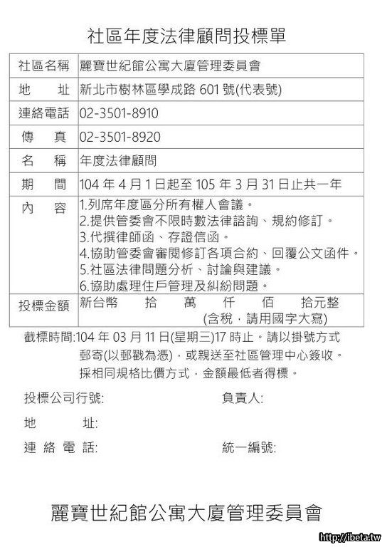 104025公告 年度法律顧問公開招標