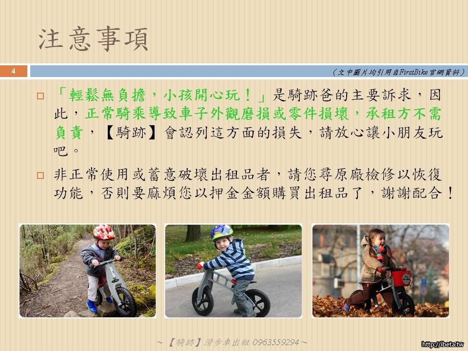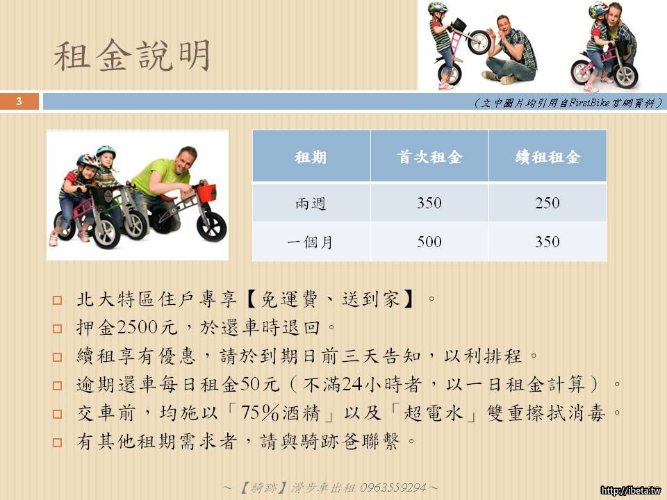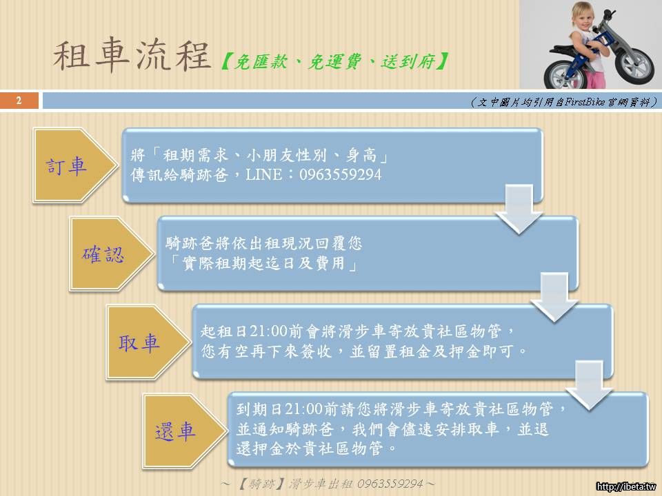 綜上四點,騎跡爸家中最後換成FirstBIKE的滑步車,也證明這確實是部好車,小朋友也愛不釋手!因此將這台車推薦給大家,許多網友的經驗是騎一、兩個月就能直上腳踏車,因此有些家長覺得用買的也不划算,畢竟這車也不便宜,所以騎跡爸幫還在煩惱的爸比媽咪們提供滑步車租借的服務,讓同樣住在北大特區內的爸比媽咪們享受「不用匯款真方便、在地取車真輕鬆!」的便利服務!