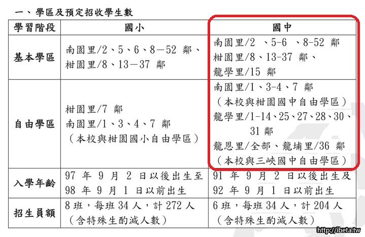 【備註】:北大高中國中部無自由學區