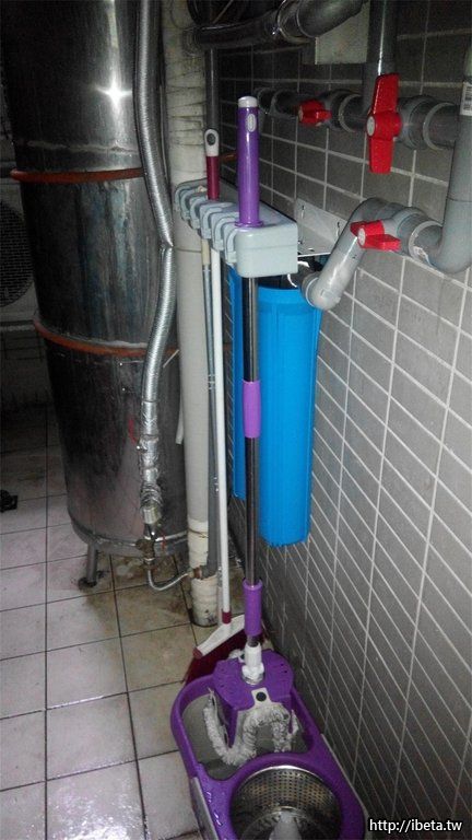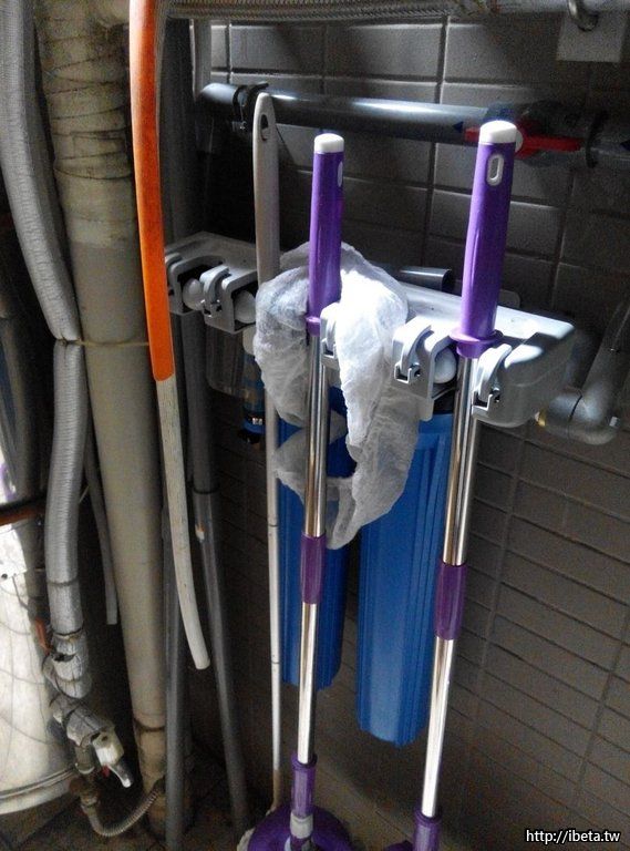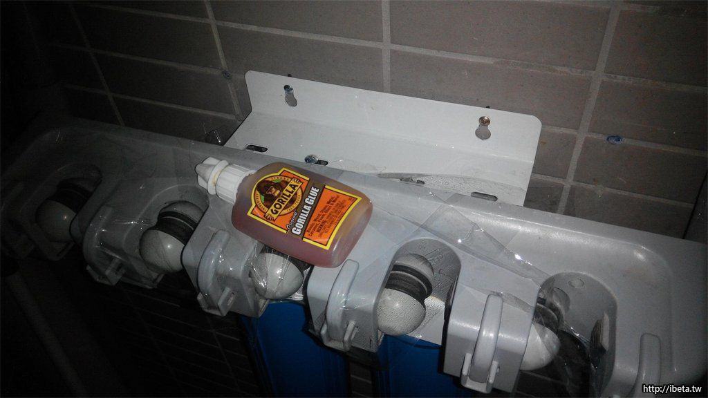 因為佔用了原本放置拖把的位置,使用 金鋼固力膠 把座子固定在濾水器的架子上! 搞定! 完全不佔空間了!