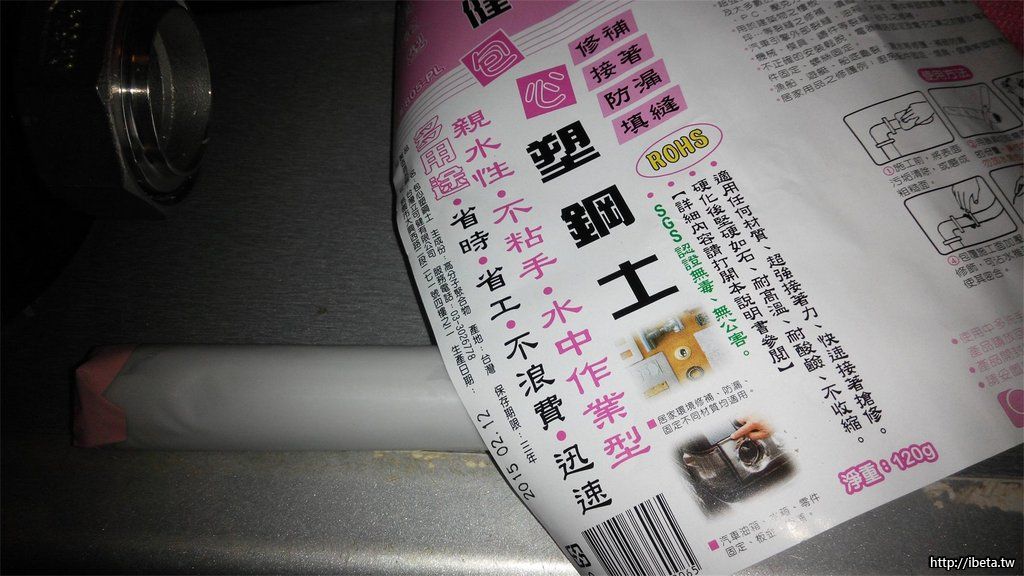 最後使用本次工程最神秘的東西! 金鋼固力膠 (原本金屬接頭要用 缺氧膠 的,但是若是未來想要改東西,要用加熱才能拆掉,改用金鋼固力膠,有 缺氧膠 的優點,拆除也不用加熱,並且可以協助 止水帶完全密閉金屬元件接縫處,比 PVC 硬化接合齊好用太多了)