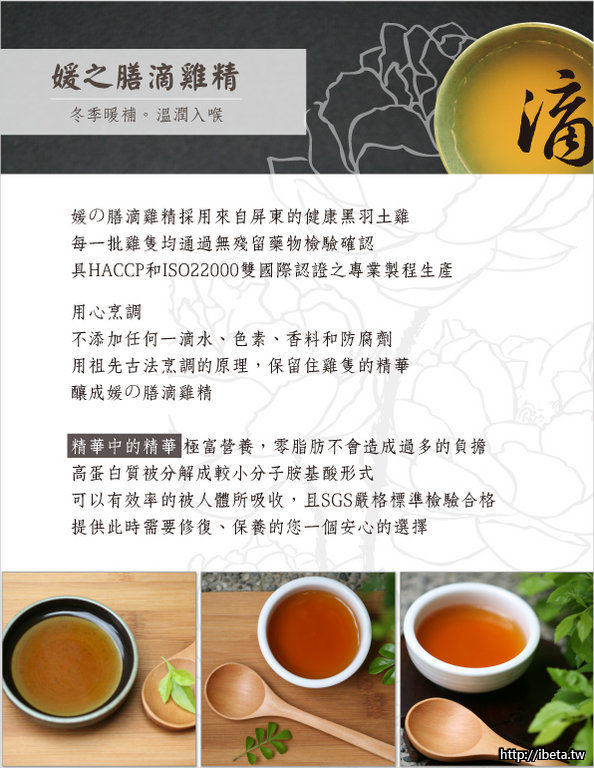 媛之膳食補膳食包括:使用屏東黑羽土雞100%無添加的滴雞精、亞洲大學研發富含60%多醣體有機栽植的我愛銀耳,以及八種精心調理的中藥食補膳食煲湯。所有產品無論是內容物或包裝材料,均經過多項高標準檢驗合格。冷凍宅配,解凍即食,全方位營養補充,方便衛生。