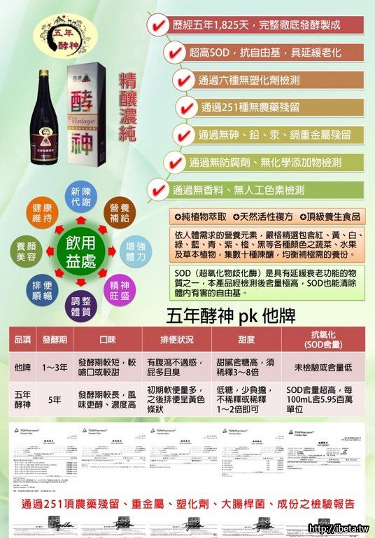 此家酵素公司已18年,專門生產酵素原液,此產品為發酵五年精釀,數十種草本植物、蔬菜、水果、海藻、益生菌等黄金配比而成,低糖濃稠,超高SOD(經杜夫萊茵檢測:超氧化物歧化酶 5.95*100萬 unit/100mL,註:廠商提供),比市售的發酵期更久、更濃,SOD更高。
