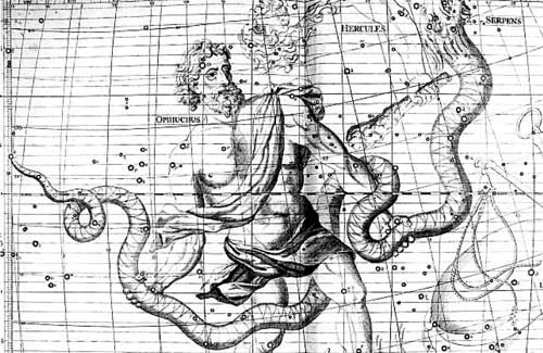 蛇夫座(Ophiuchus)在希臘神話中,指的是醫藥之神艾斯克雷皮亞斯(AsclePius),他因醫術精湛,甚至可起死回生,惹惱冥王。冥王向天神宙斯抱怨,宙斯因此將艾斯克雷皮亞斯處死,但又佩服其醫術,因此把艾斯克雷皮亞斯與他殺死的蛇一同升到天上,成為蛇夫座。