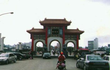(編按:附圖(1)即為交由大陸包工製作的青平石柱,和祖師廟原有的風格蹭格不入,而顯得頗為滑稽。附圖(2)是長福橋上的模製石獅。)