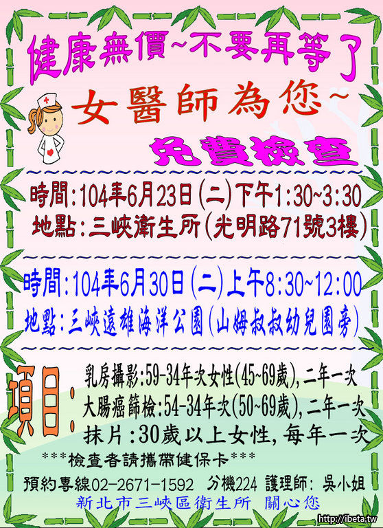 三峽衛生所6/23、6/30女醫師子宮頸抹片檢查