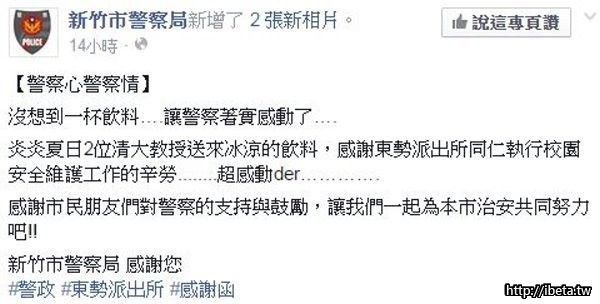 新竹市警局臉書粉絲專頁小編11日晚間PO出2張照片表示,有2位清大教授送了冰涼的飲料給東勢派出所同仁,感謝他們維護校園安全的辛勞,沒想到一杯飲料就讓警察們「超感動der」!同時也感謝市民朋友對他們的支持與鼓勵。