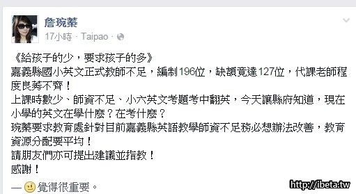 詹琬蓁也在自己臉書提到,「嘉義縣國小英文正式教師不足,原本編制196位,缺額卻高達127位」,並且代課老師的程度良莠不齊,面臨上課時數少、師資不足的問題,王建龍則表示,「嘉義縣聘請英文教師的經費不足,將會逐年補齊師資。」