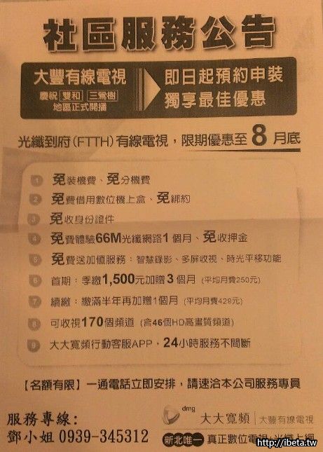 大豐現在裝機先繳3個月再送3個月 ( $1500)